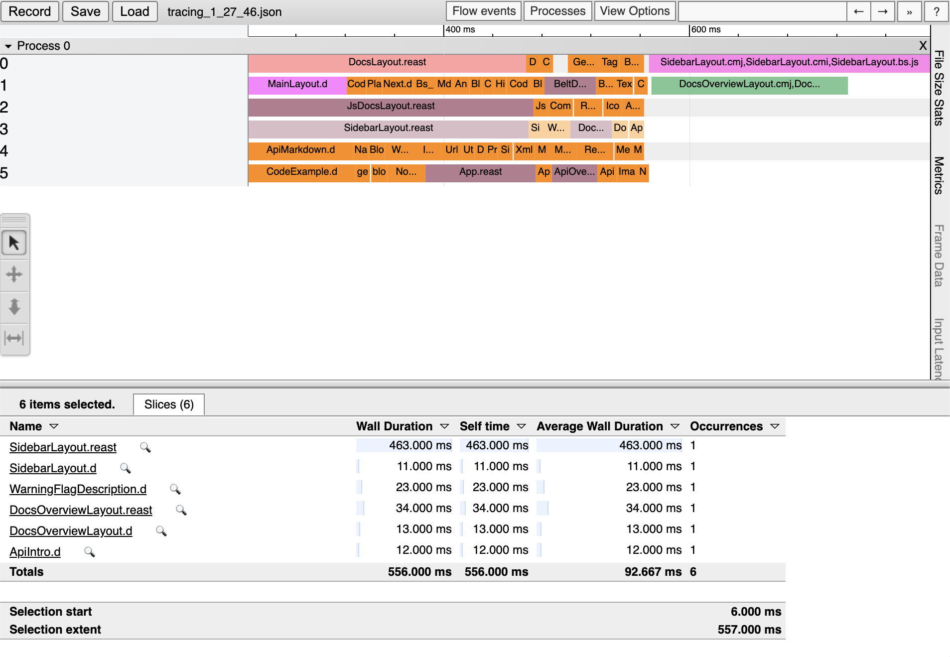 Run the above command at your ReScript project's root; it'll spit out a JSON file you can drag and drop into chrome://tracing.